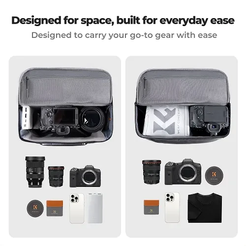 A modern fotósok és városi kalandorok számára tervezett K&F Concept KF13.212 Urban Wander kameratáska tökéletes egyensúlyt biztosít a stílus, a védelem és a praktikum között. 10 literes űrtartalmával ez a kompakt, mégis tágas válltáska ideális a fényképezőgép felszerelés, a mindennapi szükségleti cikkek, vagy akár egy kis drón felszerelés szállításához. A táska időjárásálló külseje és tartós, vízálló anyagai megvédik felszerelését az esőtől, a portól és a véletlen fröccsenésektől – tökéletes választás városi fotózásokhoz és szabadtéri utazásokhoz egyaránt. A testreszabható, párnázott elválasztók rugalmas elrendezést biztosítanak fényképezőgépének, objektívjeinek és kiegészítőinek, míg a gyorsan hozzáférhető oldalsó nyílás garantálja, hogy soha ne maradjon le egy felvételről sem.
