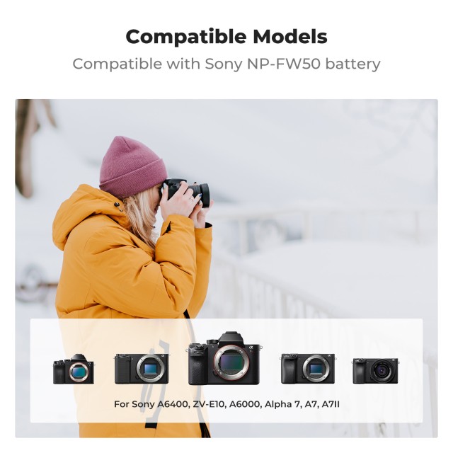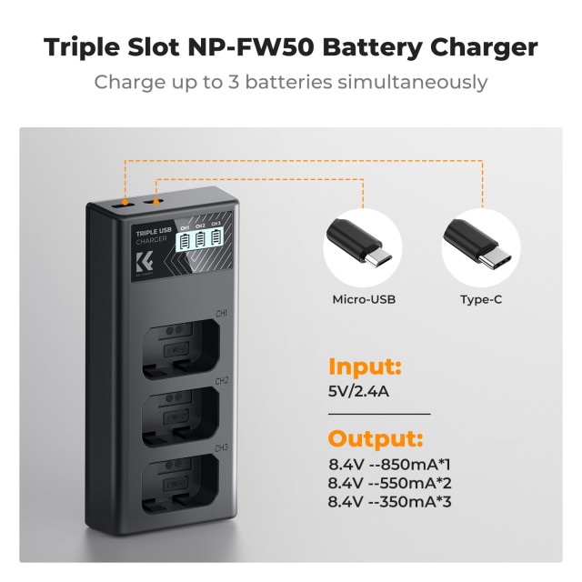 A K&F Concept 3 darabos kameratöltővel könnyedén feltöltheti Sony NP-FW50 akkumulátorait. A háromfoglalatos töltő, az intelligens LCD-kijelző és a sokoldalú töltési lehetőségek USB-n vagy Type-C-n keresztül biztosítják, hogy az akkumulátorok mindig készen álljanak az akcióra.