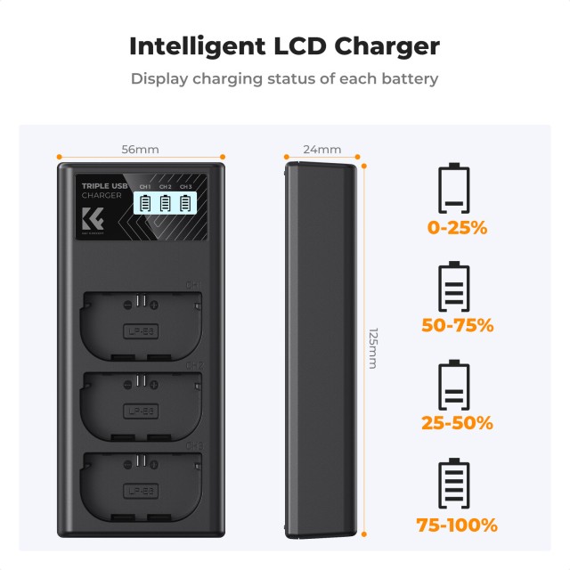 A K&F Concept Sony NP-FZ100 3 darabos fényképezőgép-töltő LCD kijelzővel a tökéletes töltési megoldás a megbízhatóságot és kényelmet igénylő fotósok számára. A kompakt töltőt úgy tervezték, hogy egyszerre akár három Sony NP-FZ100 akkumulátort is tölteni tudjon, így tökéletes stúdióhasználatra és utazáshoz egyaránt.