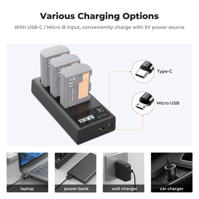 Töltse hatékonyan Sony NP-FZ100 akkumulátorait a K&F Concept 3 darabos kameratöltővel. Háromfoglalatos kialakítással, intelligens LCD-kijelzővel és sokoldalú USB és Type-C töltési lehetőségekkel biztosítja, hogy mindig legyen áram a következő felvételhez.
