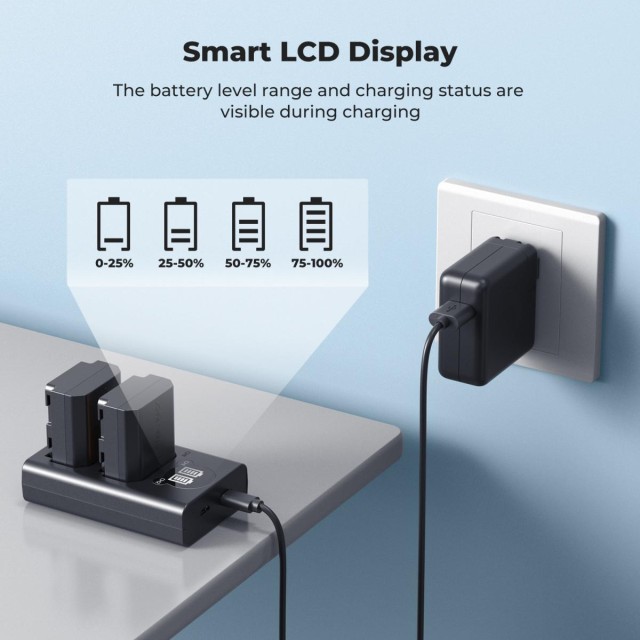 A készletben található egy kétrétegű LCD-töltő, amely egyszerre két NP-FZ100 akkumulátort képes tölteni. Az LCD-kijelző valós időben mutatja az egyes akkumulátorok töltési állapotát, így könnyen figyelemmel kísérhető az energiaellátás.