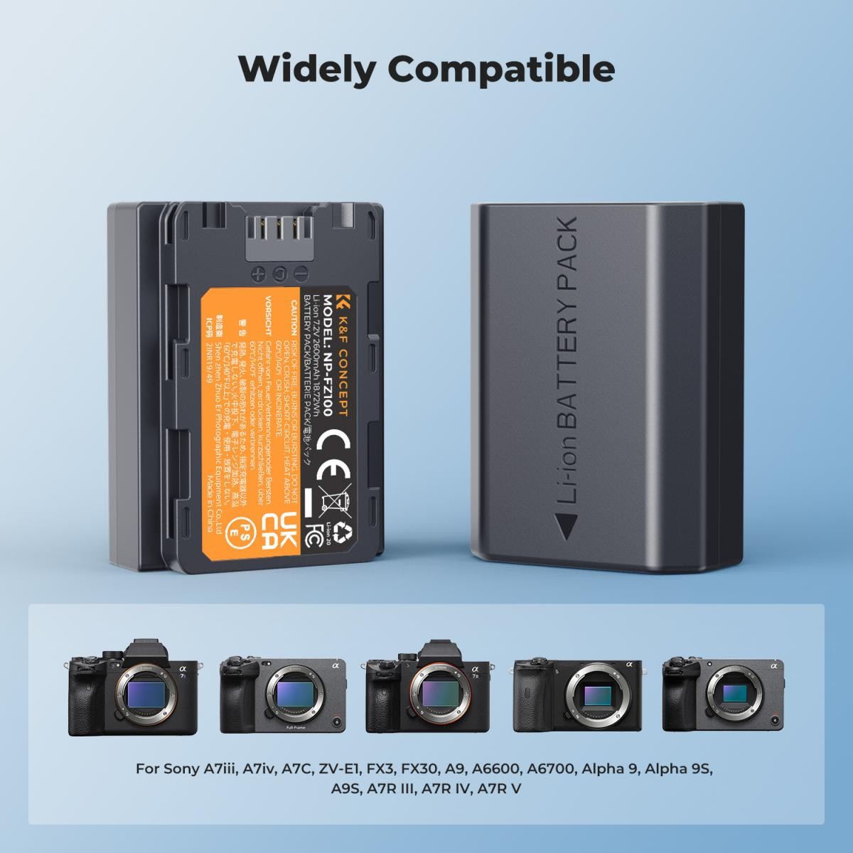A K&F Concept Sony NP-FZ100 akkumulátor készlet két nagy kapacitású, 2600 mAh-s akkumulátort tartalmaz, amelyek hosszabb üzemidőt biztosítanak a zavartalan fényképezéshez. Professzionális és lelkes fotósok számára tervezett akkumulátorok teljes mértékben kompatibilisek a Sony A7III, A7IV, A7C, ZV-E1, FX3, FX30, A9, A6600, A6700, Alpha 9/9S, A7R III/IV/V fényképezőgépekkel, és teljes akkumulátor-dekódolással megbízható teljesítményt nyújtanak.