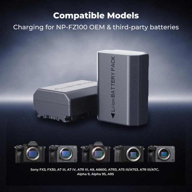 Sony NP-FZ100 18 W-os moduláris gyorstöltő és akkumulátor készlet, 2600 mAh nagy kapacitású akkumulátor Sony A7iii, A7R V, IV, Alpha A7C, A6700, ILCE-1M2, A7R3, ZV-E1, FX3, FX30 készülékekhez.