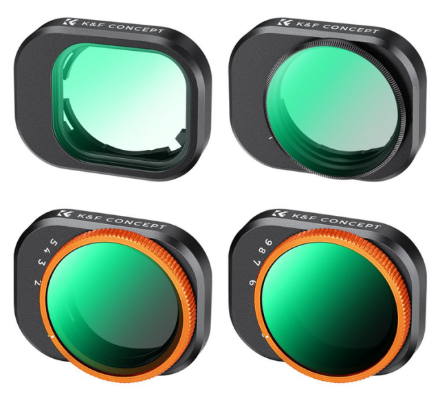 A K&F Concept VND + UV + CPL szűrőkészlet a DJI Mini 4 Pro-hoz négy alapvető szűrőt kínál (UV, CPL, ND2-32, ND32-512), amelyek 1-9 fokozatú fénycsökkentést és védelmet biztosítanak a jobb légi fényképezéshez. A többszörösen bevonatos AGC optikai üvegből készült ultrakönnyű szűrők kiváló képminőséget és kardán biztonságot biztosítanak.