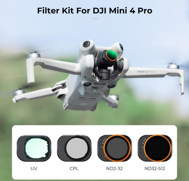 Átfogó Mini 4 Pro szűrőkészlet: Ez a 4 darabos szűrőkészlet UV, CPL, ND2-32 és ND32-512 szűrőket tartalmaz, amelyeket úgy terveztek, hogy a drónfotózás számos forgatókönyvét lefedjék, a tükröződés csökkentésétől és a lencse védelmétől kezdve a fény kezeléséig a kiegyensúlyozott expozíció érdekében a különböző fényviszonyok mellett.