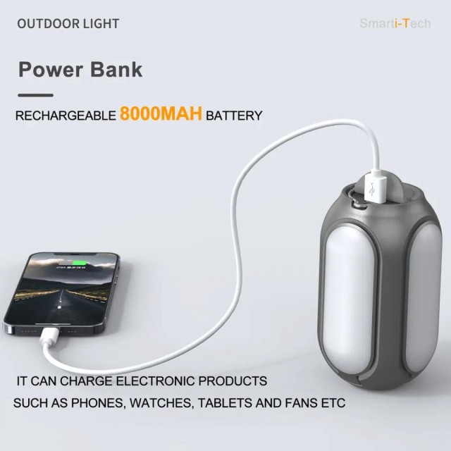 * Mobil áramforrásként is használható: ez a kempingvilágítás beépített 8000mah nagy kapacitású akkumulátorral rendelkezik, amely egy DC 5V 2A USB kimeneti porttal rendelkezik, hogy túrázás vagy kempingezés közben gyorsan tölthesse mobiltelefonját, iPhone-ját, táblagépét és más eszközeit USB töltőkábelen keresztül.