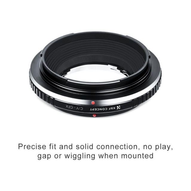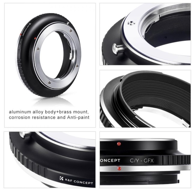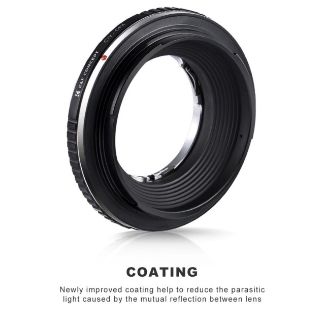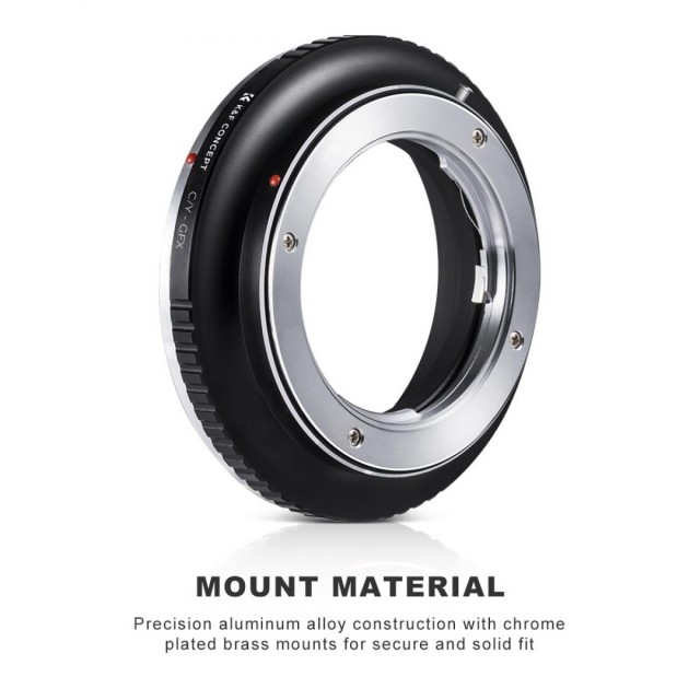 A K&F Contax/Yashica–Fuji GFX objektívadapter lehetővé teszi a C/Y bajonettes objektívek használatát a Fujifilm G-bajonettes GFX középformátumú fényképezőgépeken. Precíziós, teljes egészében fémből készült szerkezete krómozott sárgaréz bajonettekkel rendelkezik, stabil kézi működtetést és végtelen fókuszt biztosít.