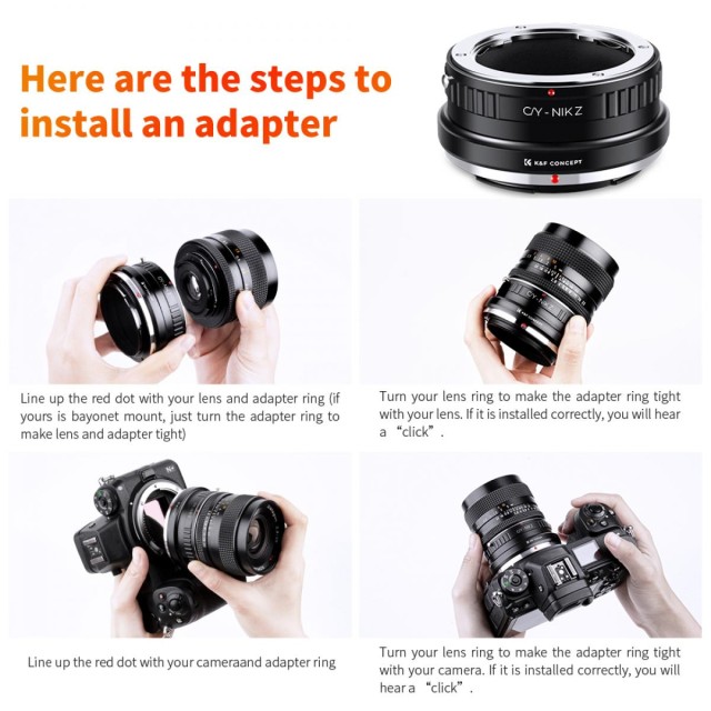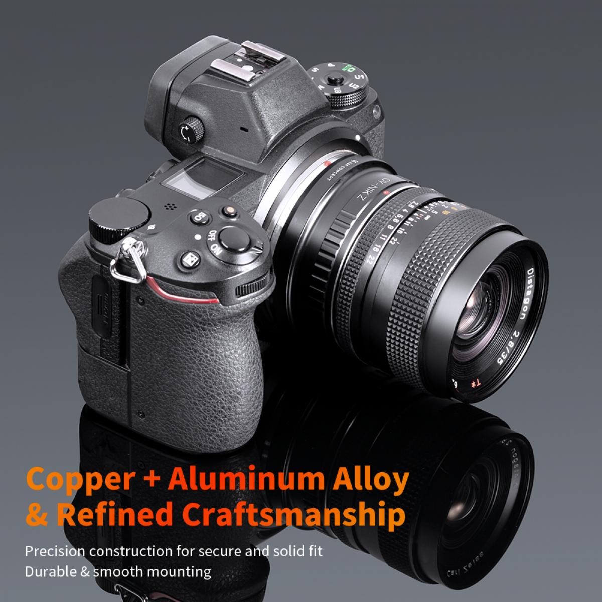 A K&F Concept Contax Yashica to Nikon Z Lens Adapter lehetővé teszi a Contax/Yashica (C/Y) bajonettű objektívek használatát a Nikon Z bajonettű tükör nélküli fényképezőgépeken, mint például a Z6 és a Z7. Sima réz interfésszel rendelkezik, amely megkönnyíti a felszerelést, támogatja a teljes manuális működést végtelen fókusszal, és egyértelmű igazítási jelölésekkel rendelkezik a könnyű felszerelés érdekében.