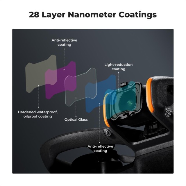 - * 【28 többrétegű bevonatú optikai üveg】Minden szűrő importált AGC optikai üvegből készült, a képminőségre nincs hatással, biztosítja a kép tényleges színének helyreállítását. Az üveg kettős oldala többrétegű bevonatot fogadott el, amely segít a víz, a por, a zsír és a karcolás elleni védekezésben. Könnyen tisztítható és karbantartható, és védi az Avata 2 lencsét mindenhonnan.