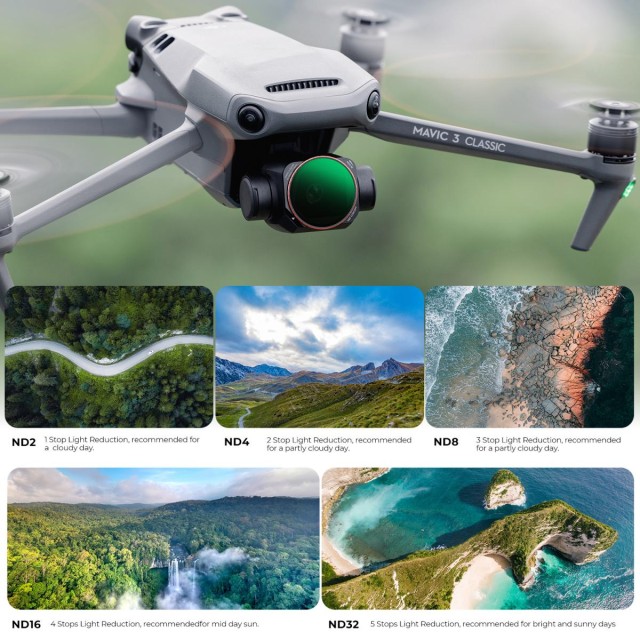 A szűrő kiváló minőségű japán AGC optikai üvegből készül, és 28 rétegű nanobevonattal rendelkezik, amely jelentősen csökkenti a tükröződéseket, a fények és a szellemképek kialakulását, miközben megőrzi a színek pontosságát. A hidrofób és szennyeződésgátló bevonatnak köszönhetően a szűrő vízálló, olajálló és könnyen tisztítható, így megbízható teljesítményt nyújt nehéz kültéri körülmények között is. A szűrő felülete feketére van festve, hogy tovább minimalizálja a belső tükröződéseket és megőrizze a képminőséget. Precíziós bajonettkeret-kialakítása tökéletes illeszkedést biztosít a Mavic 3 Classic objektív alapjához, lehetővé téve a gyors felszerelést és a biztonságos rögzítést. Súlya mindössze 3,2 g (ND) vagy 4,2 g (ND&PL), teljesen gimbal-biztos, és nem befolyásolja a repülés stabilitását vagy kalibrálását.