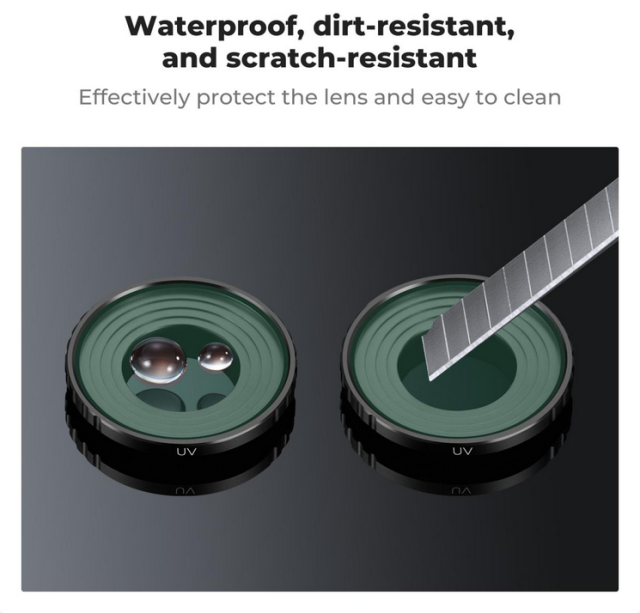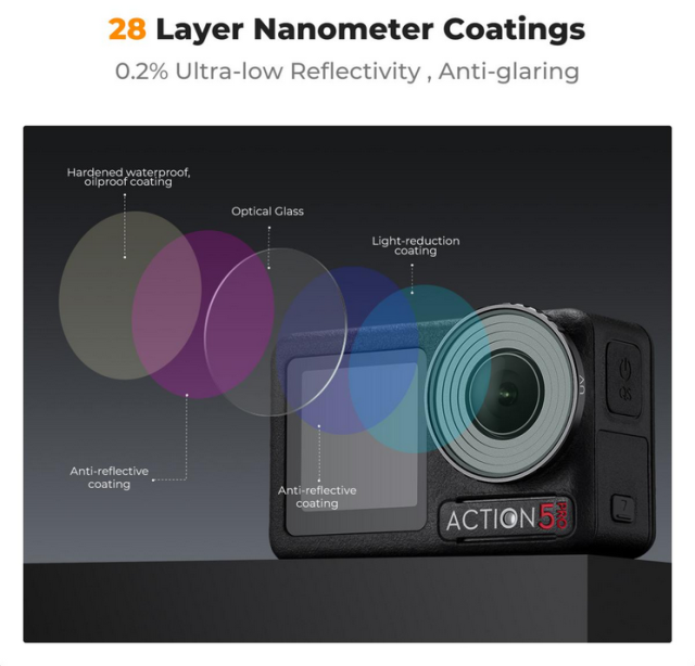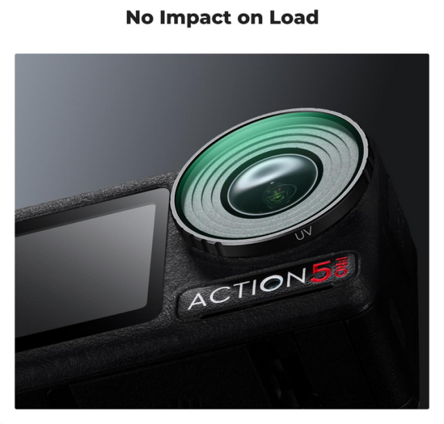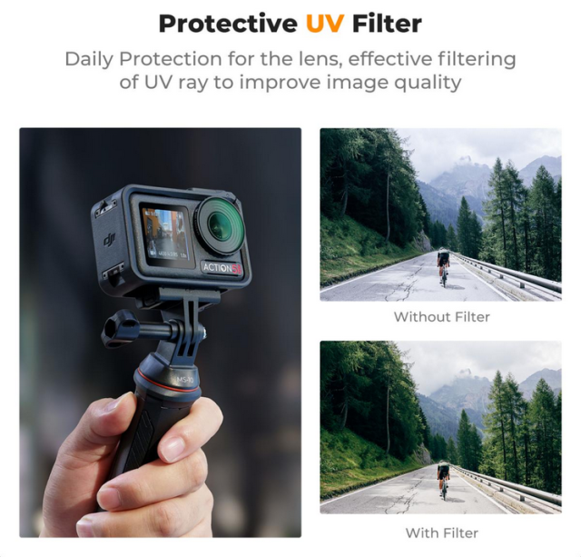 - Objektívvédelem UV-védelemmel: Ez a szűrő hatékonyan blokkolja az UV-sugarakat, csökkentve azok hatását a kép tisztaságára, miközben megvédi az akciókamera objektívjét a karcolásoktól, portól és víztől.