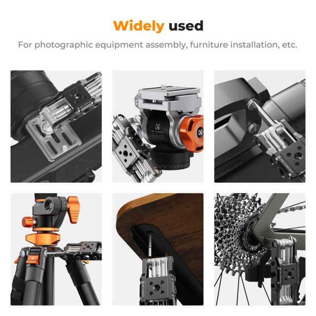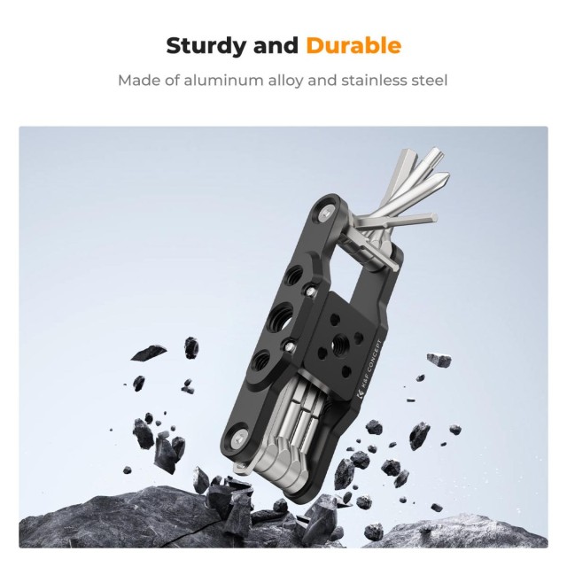10 az 1-ben multifunkciós szerszám: A zsebkés 6 imbuszkulccsal (2,0, 2,5, 3, 4, 5, 3/16") és 4 csavarhúzóval (T25 Torx, Phillips, SL7 és lapos fej) rendelkezik. Tartalmaz extra menetes lyukakat pótcsavarokhoz (3/8" × 2, 1/4" × 5). Hordozható csavarhúzó készlet alumíniumötvözetből és rozsdamentes acélból, a tartósság érdekében. A csavarhúzók és a kulcsok nagy szilárdságú acélból készültek, kiváló tartósságot és törésállóságot biztosítva.