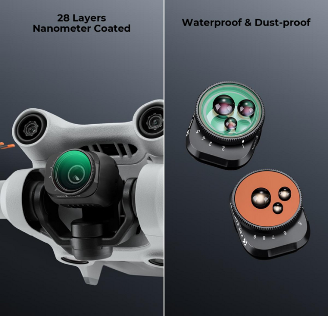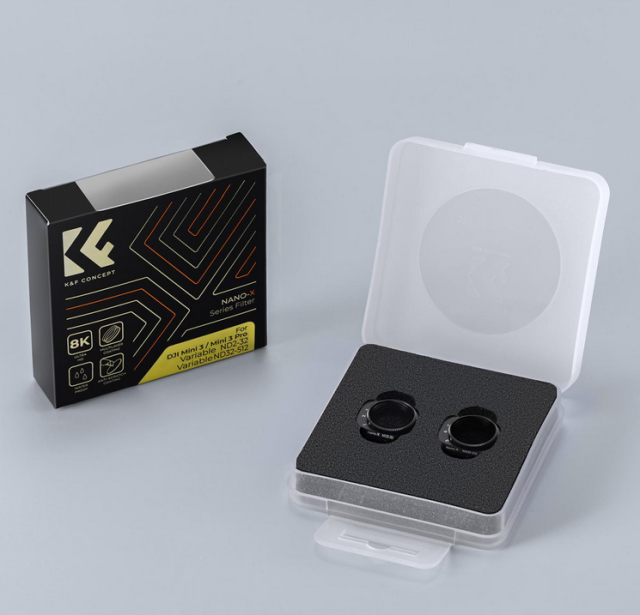 A K&F Variable ND szűrőkészlet a DJI Mini 3 Pro és Mini 3 modellekhez állítható ND2-ND32 és ND32-ND512 szűrőket tartalmaz, amelyek lehetővé teszik a pontos expozíciószabályozást színeltolódás nélkül. A kiváló minőségű AGC optikai üvegből készült, 28 réteg nano bevonattal ellátott szűrők csökkentett tükröződéseket, vízállóságot, karcállóságot, valamint penész és olaj elleni védelmet biztosítanak. Ultrakönnyűre tervezték őket, így nem befolyásolják a drón gimbaljának teljesítményét, és gyorskioldós kialakítással rendelkeznek az egyszerű és biztonságos felszerelés érdekében.