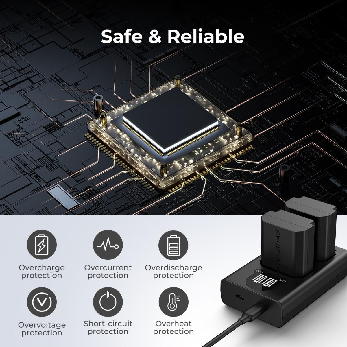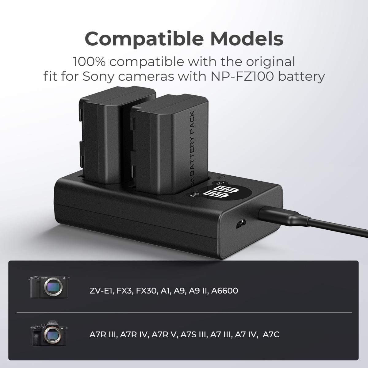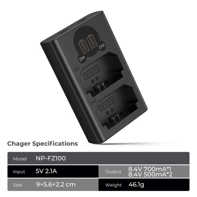 Töltse hatékonyan Sony NP-FZ100 akkumulátorát a K&F FZ100 kétcsatornás töltővel. Két töltőporttal és sokoldalú USB-C/Micro USB bemenettel ellátott töltő egyszerre két akkumulátort is képes tölteni, miközben intelligensen védi a túltöltés, a túláram és a túlmelegedés ellen.
