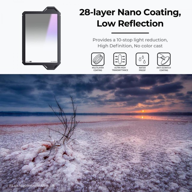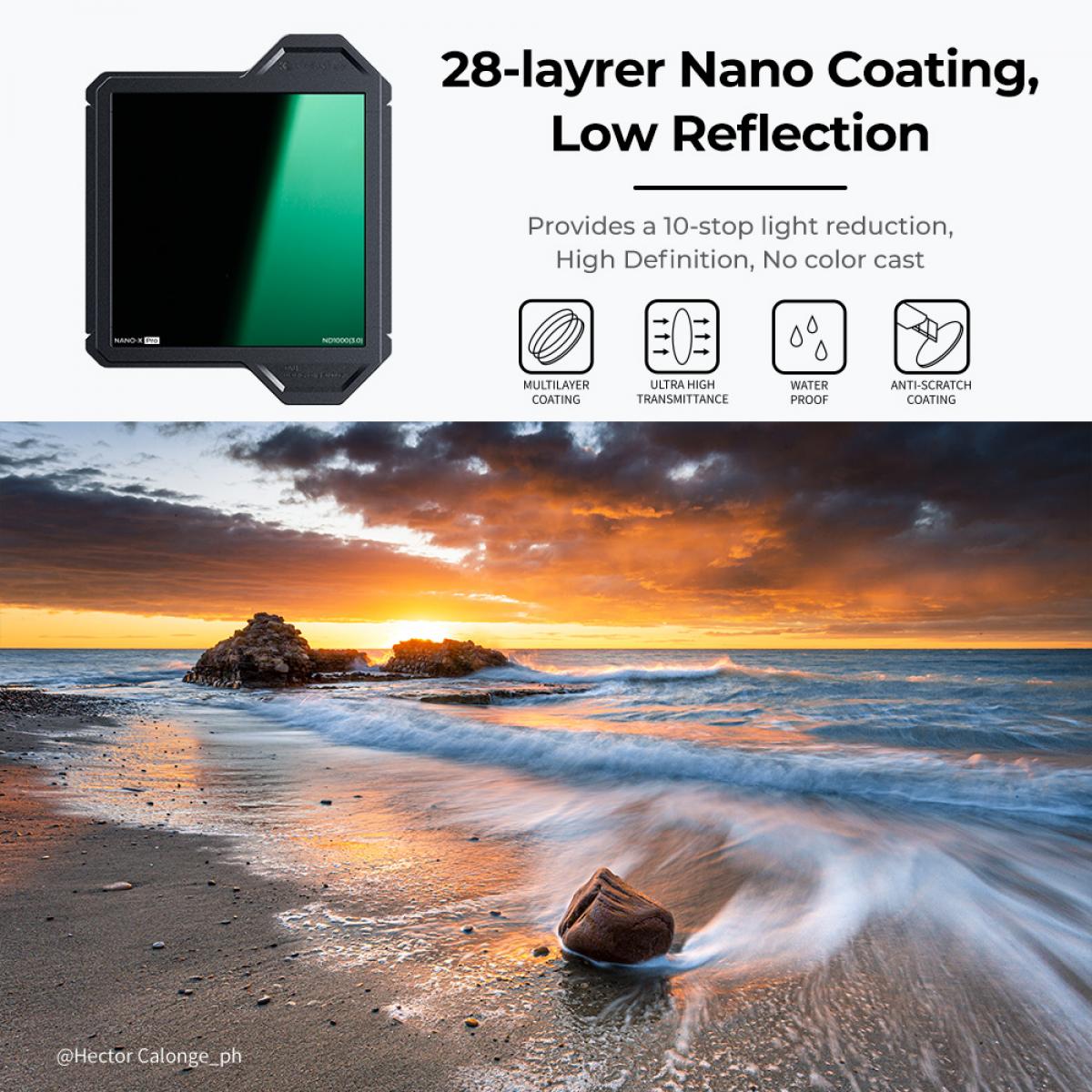 Szuper átmérőjű, ultravékony: tartóvastagság 12 mm, 91 mm nagy tiszta nyílás. Hatékonyan csökkenti a vignettálás valószínűségét ultraszéles látószögű objektív használata esetén. Könnyen eltávolítható, nincs fényszivárgás: két négyzet alakú szűrő egymásra helyezhető egy tartóban, és a CPL a szűrőtartó fedelének felemelésekor kiemelkedik. Minden, amire szüksége van az induláshoz, beleértve a 95 mm-es CPL-t és egy 4 adaptergyűrűből álló készletet 67, 72, 77,82 mm átmérőben. Nano bevonat: ND1000 (10 fokozatú) optikai üveg 28 rétegű nanobevonattal. 10 fokozatú fénycsökkentést biztosít, porálló, vízálló, foltálló és karcálló.