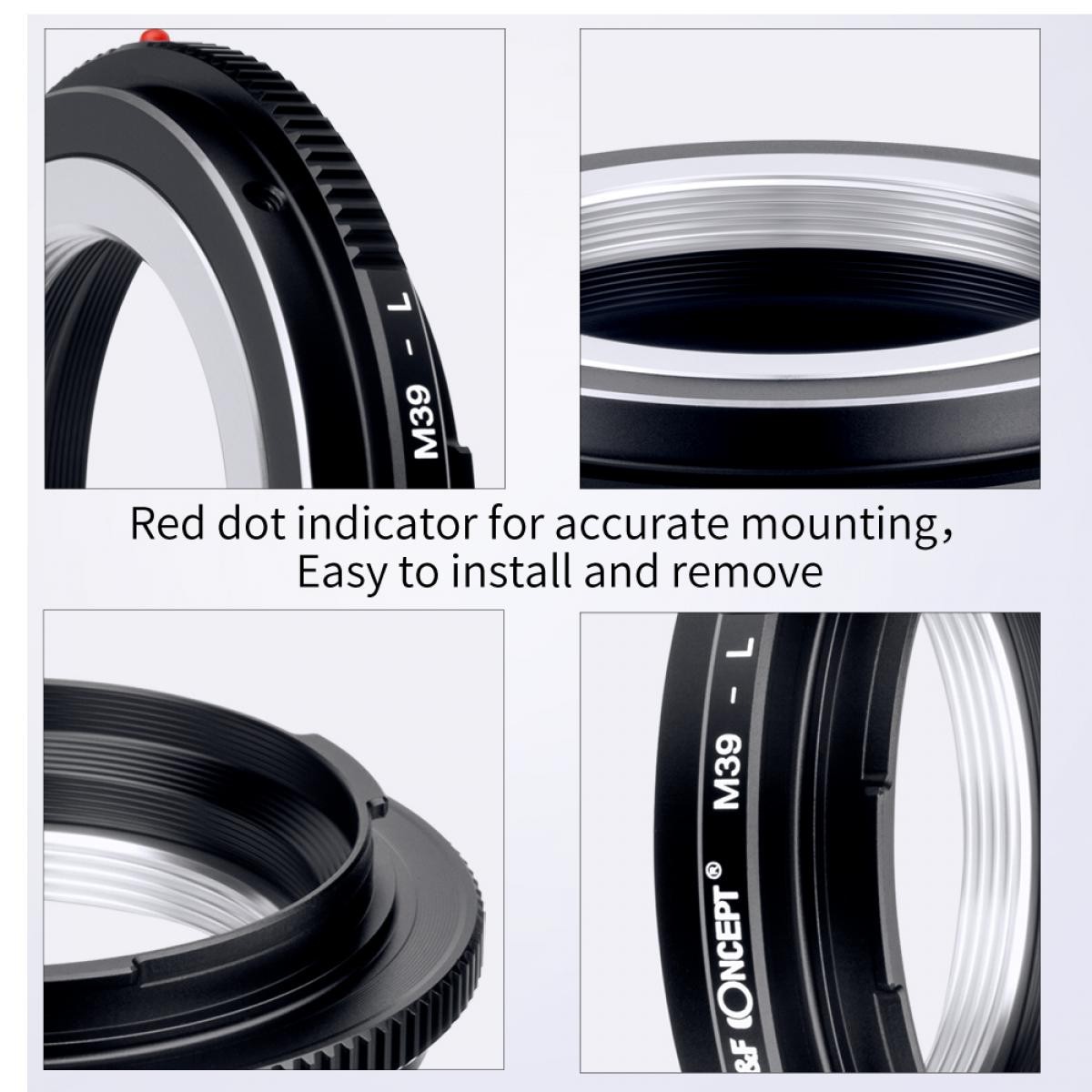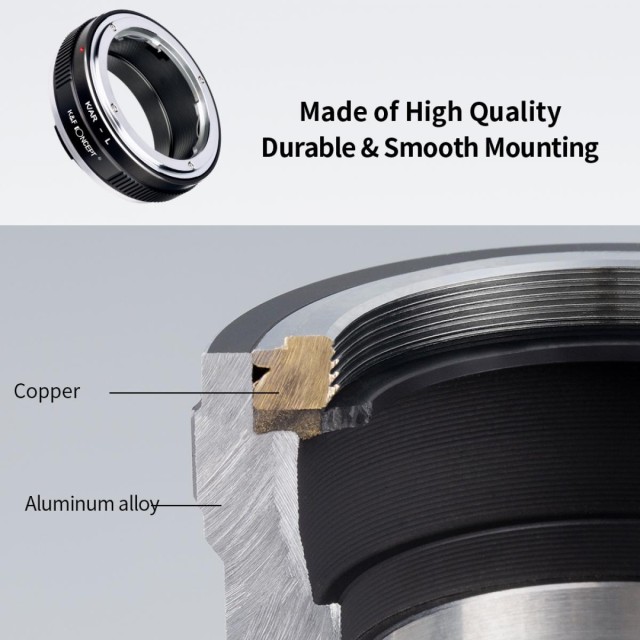 A K&F nagy pontosságú M39–L-Mount objektívadapter lehetővé teszi a Leica M39-es bajonettes objektívek használatát L-Mount bajonettes tükör nélküli fényképezőgépeken. Kiváló minőségű réz és alumíniumötvözetből készült, precíz illesztéssel, sima összeszereléssel, teljes kézi vezérléssel és állítható rekeszgyűrűvel rendelkezik.