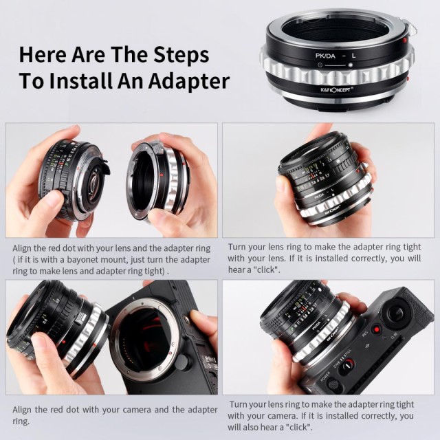 A PK/DA-L manuális fókuszáló adapter kompatibilis a Pentax K (PK/DA) objektívekkel, és L Mount bajonettes fényképezőgépekhez készült.