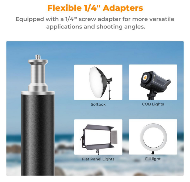 Az állvány magassága könnyen állítható 112 cm és 280 cm között, így a legkülönfélébb forgatási forgatókönyvekhez alkalmazkodik. Robusztus, 8 kg-os teherbírással rendelkezik, így ideális a nehezebb fotós felszerelésekhez. Univerzális 1/4"-os csavaros rögzítése biztosítja a kompatibilitást az eszközök széles skálájával, beleértve a fényképezőgépeket, vakukat, gyűrűs lámpákat és videólámpákat.