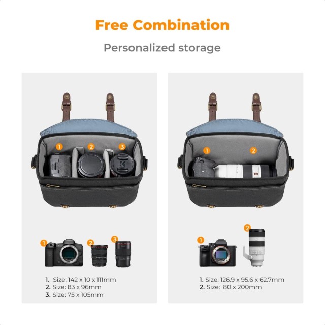 - * 【Customizable Space 】Ez a crossbody fényképezőgép táska két kivehető párnázott elválasztóval rendelkezik, hogy a különböző kamerákat, vakukat, objektíveket és egyéb fényképezőgép-felszereléseket elkülönítve és védve tartsa, a belső teret az igényeik alapján beállíthatja.