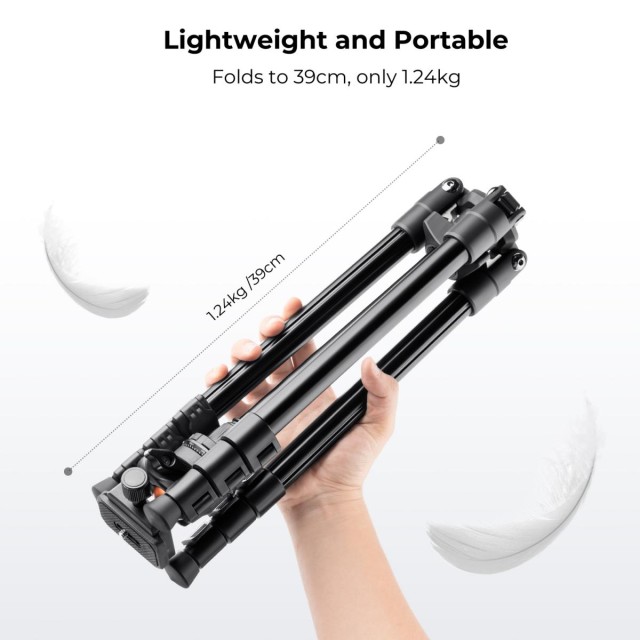 Kompakt és hordozható állvány - Tökéletes utazáshoz, vlogoláshoz és munkához. Minőségi katonai magnézium-alumínium ötvözet, korrózióállóság; állvány gömbfejjel csak 2,56 font/1,16 kg súlyú, 180 ° -os reflexióval és 390 mm / 15,35" -re összehajtva, könnyen elhelyezhető egy hátizsákban vagy bőröndben utazáskor.