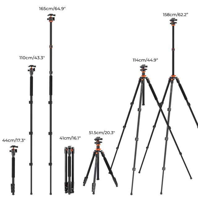 5.EASY SET UP 4 szakaszos csőszár és a maximális átmérő 25 mm; Az erőteljes és gyors flip lábzárral lehetővé teszi, hogy másodpercek alatt beállítsa a munkamagasságot; A magasság oszlop nélkül eléri a 48,8'' magasságot, a magasság 2 szakaszos középső oszloppal 62'', így az álló felvételek könnyebbek."