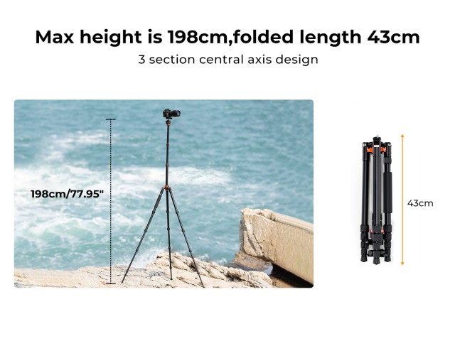 Az innovatív, 3 szekciós központi tengelyes kialakítás lehetővé teszi, hogy az állvány 198 cm-es megnövelt lőmagasságot érjen el, miközben kompakt, 43 cm-es összecsukott hosszúsággal rendelkezik. Az állvány egyesíti a praktikus tulajdonságokat és a hordozhatóságot, maximális magassága (középső oszlop nélkül) 135 cm, így könnyed stabilitást és optimális felvételi magasságot biztosít, amely tökéletes beltéri és kültéri használatra egyaránt. A maximális magasság 198cm, így a fényképezés állva könnyebb, mint valaha. A minimális magasság 56 cm, így ez a készülék szinte minden körülményhez és környezethez alkalmazkodik.