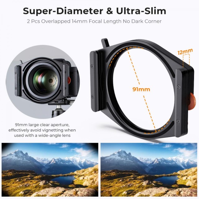 Egyedi négyzet alakú szűrőkeret 95MM CPL, 12 mm vastagságú tartó, könnyen felvehető, nincs fényszivárgás. Hatékonyan csökkenti a vignettálás esélyét ultraszéles látószögű objektív használatakor. Az ultravékony keret és a nagy átmérő biztosítja a vignettálás elkerülését nagylátószögű objektívnél, valamint a hátsó CPL kialakítás a kényelmes felszerelés és eltávolítás érdekében.
