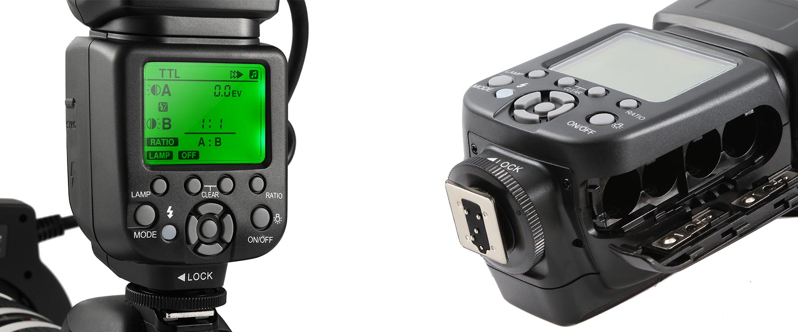 E-TTL vezérlés vaku korrekcióval, manuális vaku vezérlés és stroboszkóp/multi-vaku vezérlés. A külön fényerőszabályozó rendszerrel ellátott kettős vakucsöves kialakítás lehetővé teszi, hogy vagy mindkét csövet egyszerre, vagy mindkettőt egyszerre világítsa meg, hogy egyenletes megvilágítást érjen el a témán, amikor nagyon érzékeny fotókat készít.