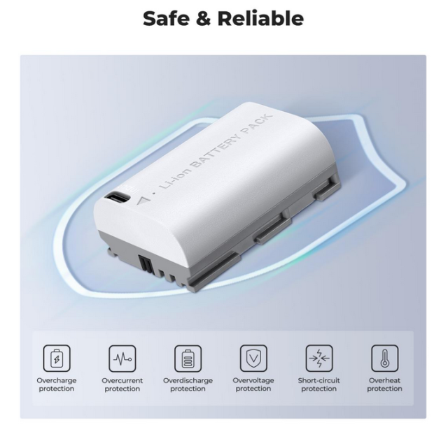 A K&F LP-E6NH 2600mAh akkumulátorcsomag Type-C gyors töltéssel Canon fényképezőgépekhez úgy lett kialakítva, hogy fotózási munkádat ne szakítsa meg semmi. A nagy teljesítményű, 2600mAh kapacitású akkumulátorok segítségével gond nélkül örökítheted meg a gyönyörű tájakat. A Type-C gyors töltés kényelme lehetővé teszi, hogy az akkumulátort a mellékelt kábellel közvetlenül csatlakoztassa a hálózati adapterhez, így körülbelül 2 óra alatt teljesen feltölthető, külön töltő nélkül. Ezek a teljesen dekódolt cserekapacitású akkumulátorok számos Canon fényképezőgéppel kompatibilisek, többek között az EOS 90D, 80D, 70D, 5D Mark II, III, IV, 5DS, SR, 6D, 6D Mark II, R5, R6, R6 II és R7 modellekkel, és nem jelennek meg figyelmeztető ablakok. Többféle töltési lehetőség áll rendelkezésre, beleértve USB-s fali töltőket, autós töltőket és power bankokat, amelyek rugalmasságot és megbízhatóságot nyújtanak hatféle védelemmel: hőmérséklet, túlfeszültség, túltöltés, túláram, túltöltés és rövidzárlat. A prémium kivitelű készülék töltésjelzője pirosan világít töltés közben, és zölden, ha teljesen feltöltődött.