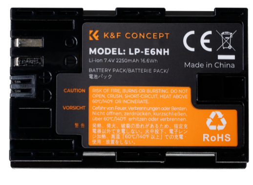 A K&F Concept LP-E6NH kameraakkumulátor (KF28.0021V2) egy nagy kapacitású, 2250 mAh (16,6 Wh, 7,4 V) lítium-ion akkumulátor, amely a Canon LP-E6/LP-E6N/LP-E6NH akkumulátorok helyettesítésére szolgál, és 8 rétegű áramkörvédelemmel és CE/RoHS tanúsítvánnyal rendelkezik, megbízható, memóriahatásmentes teljesítményt biztosítva. Teljesen kompatibilis a Canon EOS 5D/6D/7D/60D/70D/80D/90D/R/R5/R6 sorozattal és olyan kiegészítőkkel, mint az XC10/XC15, és tartalmaz egy védőburkolatot töltésjelző kivágásokkal, amely biztonságos alternatívája az OEM akkumulátoroknak hosszabb fényképezési munkákhoz.