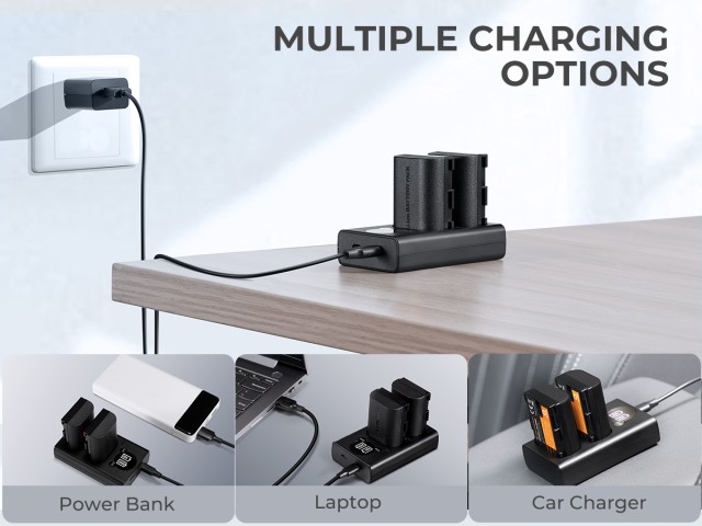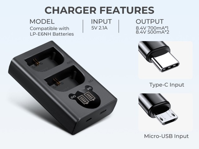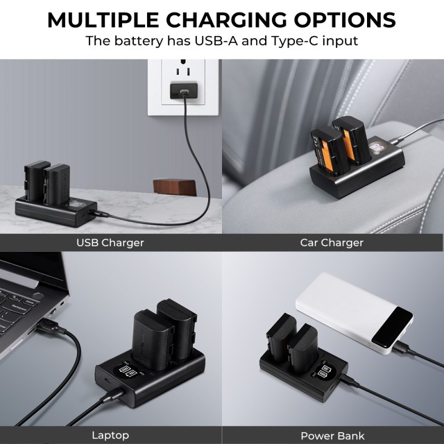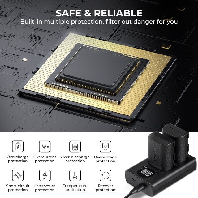 * 【Intelligens töltés】 Az LCD kettős töltő pontosan megjeleníti az akkumulátor töltési állapotát, a töltési folyamat intelligens chip használatával jobban védi az akkumulátort; a kétnyílású töltőport gyorsan tölthet két akkumulátort egyszerre, nagymértékben megtakarítva az időt, a legjobb választás az utazáshoz.