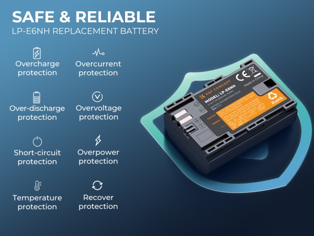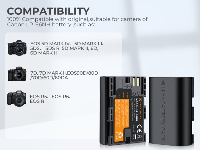 A K&F CONCEPT LP-E6NH akkumulátor kompatibilis a Canon fényképezőgépekkel, amelyek LP-E6NH/LP-E6N/LP-E6 akkumulátorokat használnak, mint például a Canon EOS R5, EOS R6, EOS R, EOS R, EOS 5D Mark IV, 5D Mark III, 5DS, 5DS R, 5D Mark II, 6D, 6D Mark II, 7D, 7D Mark II, 90D, 80D, 70D, 60D, 60Da (Megjegyzés: A fent felsorolt modellek közül csak néhány)
