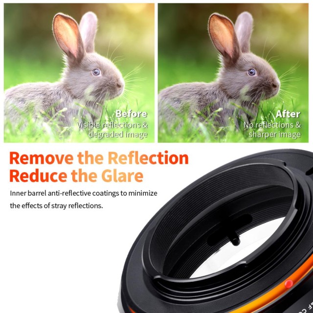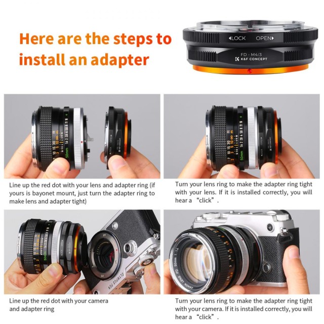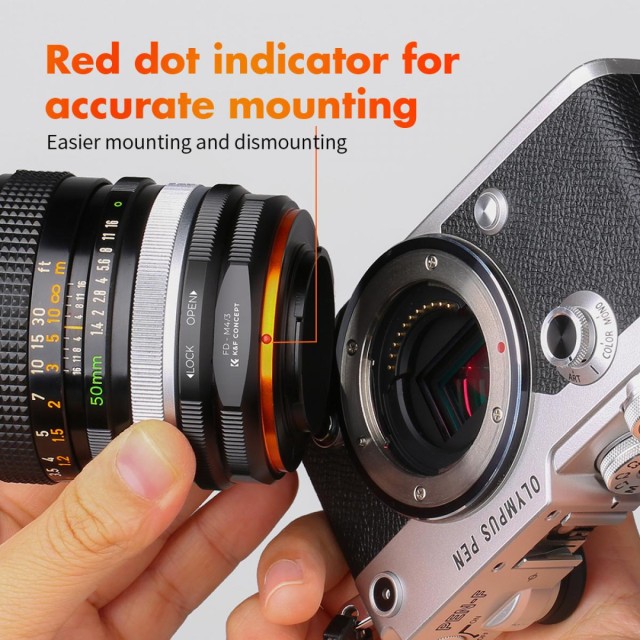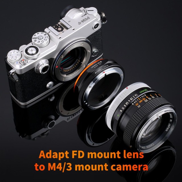 A K&F Concept FD-M4/3 manuális fókuszáló adapter kompatibilis a Canon FD objektívekkel a Micro Four Thirds M4/3 bajonettes fényképezőgépekhez.