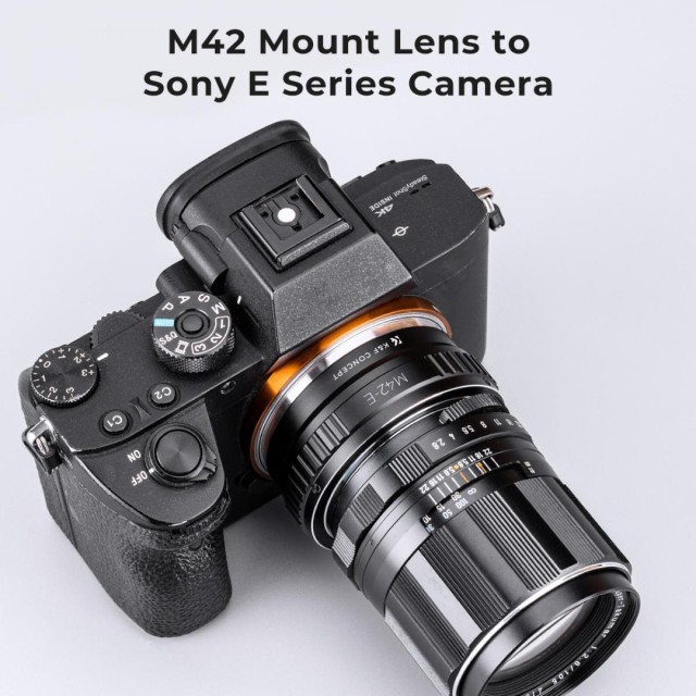 K&F M42 objektívek Sony E Mount kamera adapterhez. Lehetővé teszi az M42 foglalatú objektívek használatát Sony E NEX/Alpha fényképezőgépvázon. Sárgarézből és alumíniumból készült. Stabil, precíz és tartós konstrukció.Kézi működtetésű.Infinity fókusz megengedett.