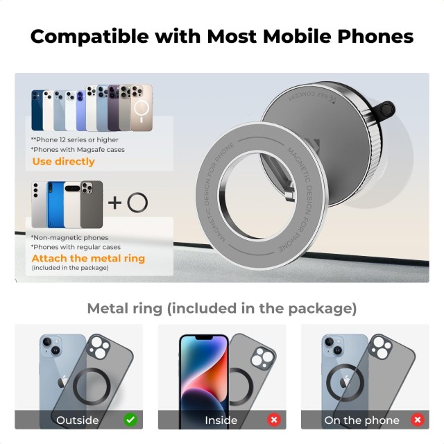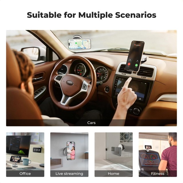 A tartó súlya mindössze 125 g, összecsukva pedig ⌀58 mm × 40 mm méretű, így rendkívül hordozható és kényelmes utazáshoz. Elsősorban MagSafe iPhone-okhoz tervezték, de a mellékelt fémgyűrűk segítségével más telefonmodellekhez is illeszthető, amelyek a készülék hátuljára rögzíthetők a mágneses rögzítéshez. A biztonság, a beállíthatóság és a hordozhatóság kombinációja tökéletessé teszi vezetéshez, streaminghez vagy asztali használathoz.