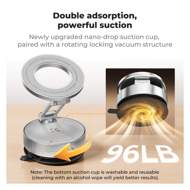 A K&F CONCEPT mágneses autós telefontartó (ezüst) egy sokoldalú, 360°-ban forgatható vákuumszívó tartóval, erős N52 mágnesekkel. Kompakt, összecsukható, kompatibilis a MagSafe iPhone-okkal és bármely telefonnal a mellékelt fémgyűrűk segítségével. Biztos tartást biztosít sima felületeken és műszerfalakon, miközben precíz többtengelyes beállítást kínál.