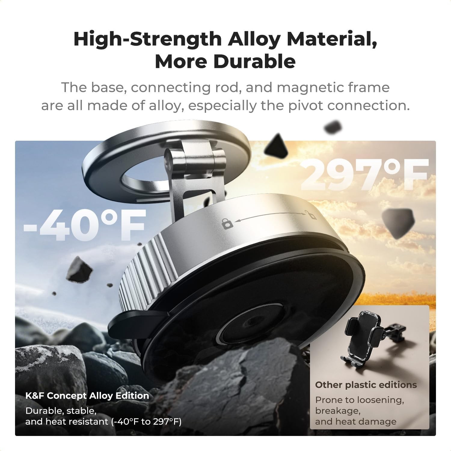 A K&F CONCEPT mágneses telefon tartó autóba (ezüst) erős mágnesességet, megbízható tapadást és háromtengelyes állíthatóságot kombinál, hogy biztonságos és sokoldalú telefon tartót hozzon létre vezetéshez, munkához vagy otthoni használatra. Kettős gyűrűs mágneses kialakítása, 20 nagy szilárdságú N52 mágnessel, még rázós utakon is biztos tartást biztosít a telefonoknak. A tapadókorong alapja nano-gél kialakítású, amely lehetővé teszi a többszöri rögzítést és tisztítást a tapadás elvesztése nélkül, és -104 °F és 298 °F (-40 °C és 148 °C) közötti extrém hőmérsékleten is működik.