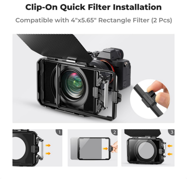 Sokoldalú és biztonságos szűrőrendszer: A matt doboz két 4x5,65"-os szűrő (4 mm vastag) befogadására alkalmas, és biztonságos reteszelő mechanizmussal rendelkezik, amely a szűrőket a helyén tartja. Ez a rugalmasság megfelel a különböző környezetekben felmerülő különféle fotózási igényeknek.