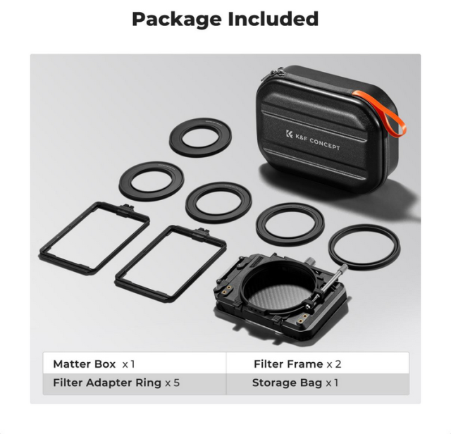 A K&F Matte Box Kit 5 adaptergyűrűt és 2 szűrőkeretet tartalmaz, amelyek könnyű szénszálból készültek, kiváló fényszabályozást és kompatibilitást biztosítanak a különböző objektívekhez.