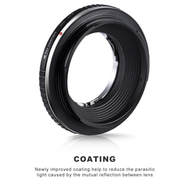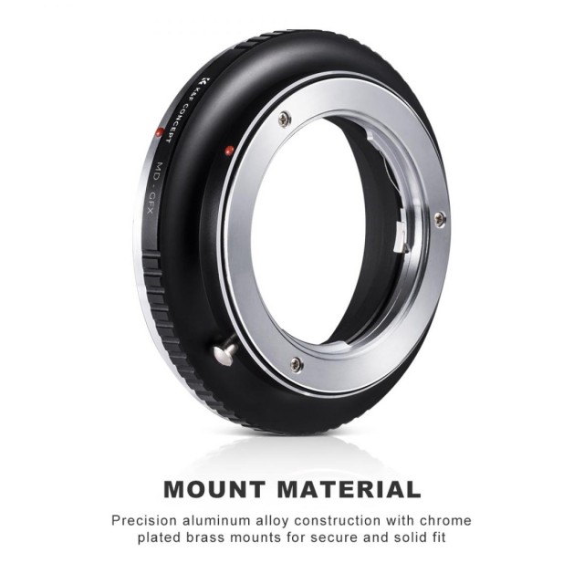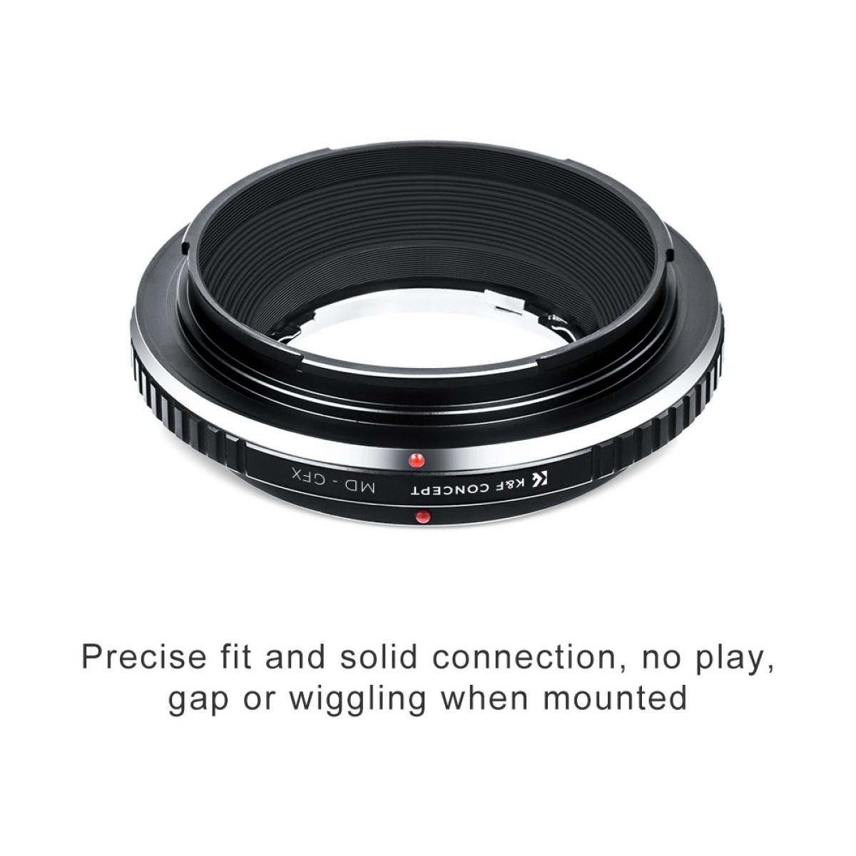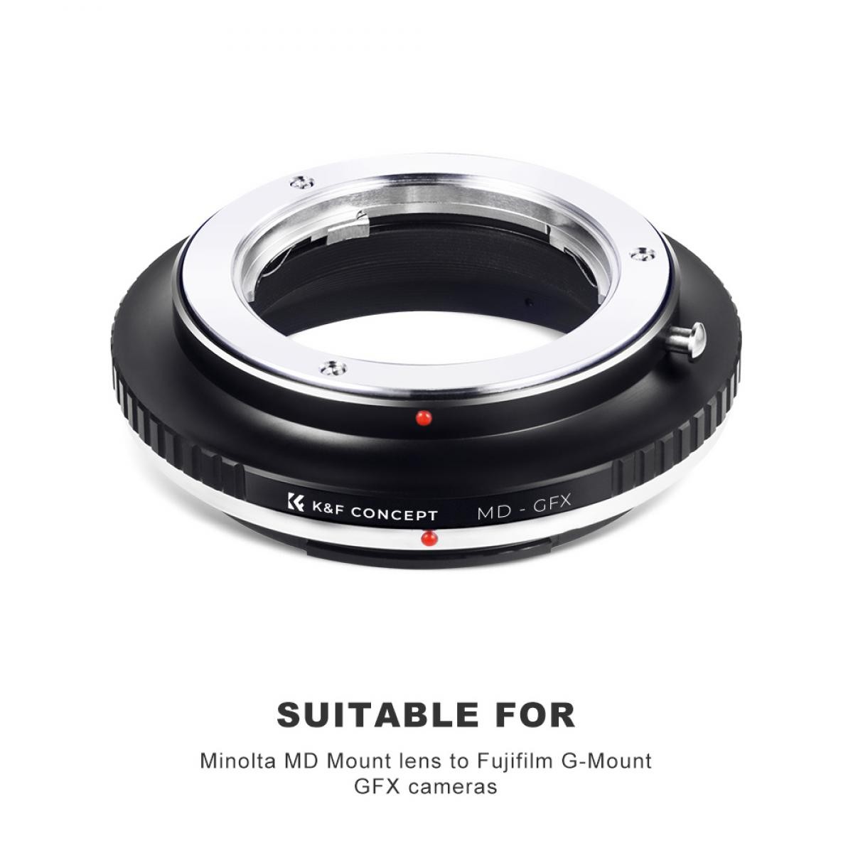 A K&F Minolta MD–Fuji GFX objektívadapter lehetővé teszi a Minolta MD objektívek biztonságos rögzítését a Fuji GFX középformátumú fényképezőgépeken, tartós fém szerkezettel és teljes manuális vezérléssel.