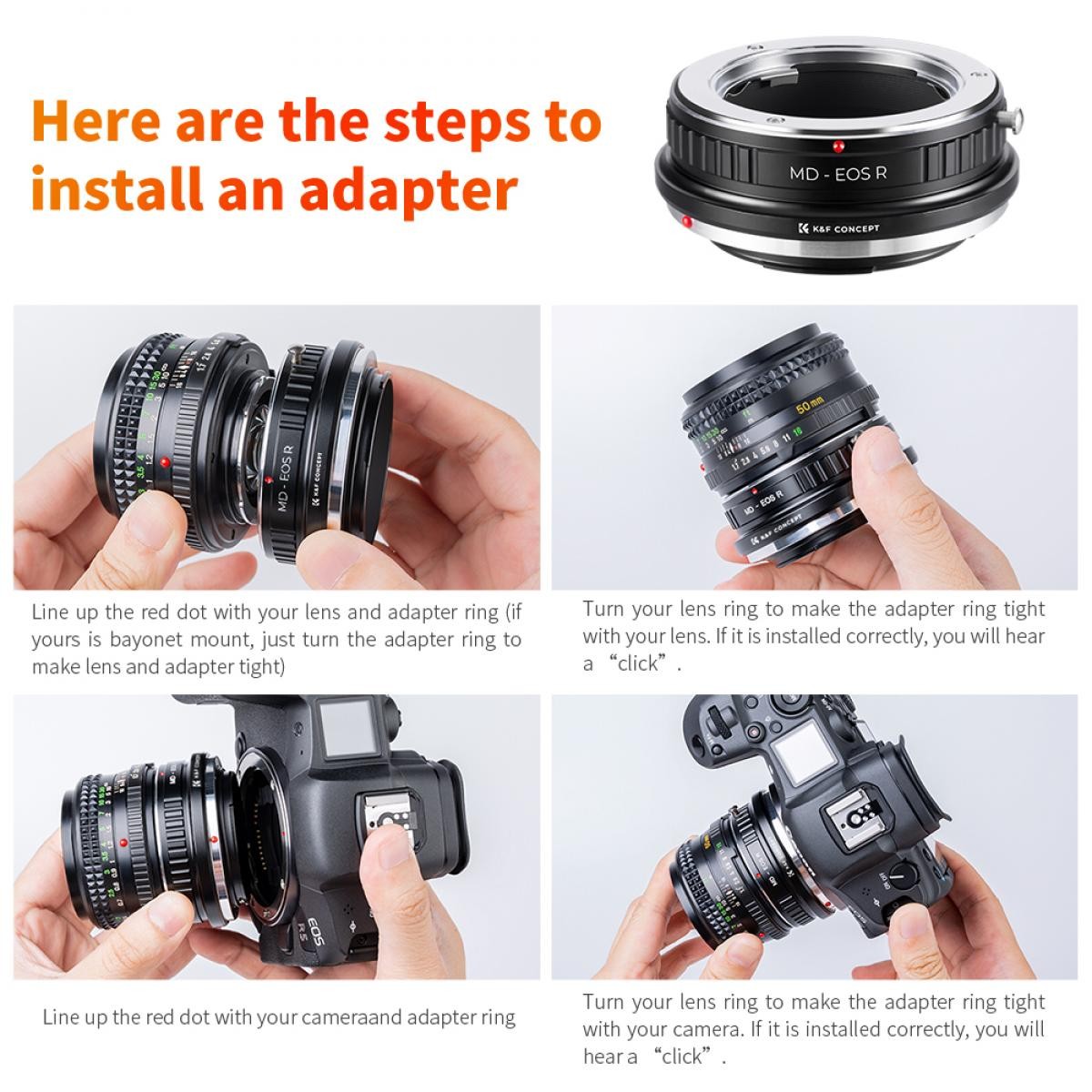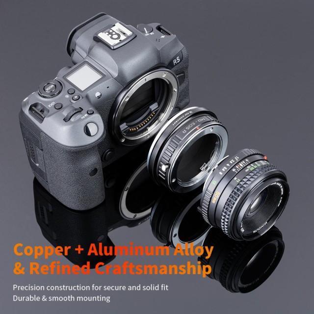 A K&F Minolta MD/MC – Canon EOS R objektívadapter lehetővé teszi a Minolta MD és MC manuális fókuszú objektívek Canon EOS R sorozatú fényképezőgépekre való felszerelését. Tartós sárgaréz és alumínium szerkezettel, sima kézi működtetéssel és teljes végtelen fókusz támogatásával rendelkezik.