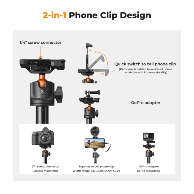 MS04 62''/1,58 m állványos telefonos szelfibot, fekete és narancssárga, Bluetooth távirányítóval + GoPro adapterrel. A maximális magasság 157,8 cm, és 7 részes lábállítással rendelkezik. A kívánt magasságot tetszés szerint beállíthatja. Ez az állványfej 3 kg teherbírással rendelkezik, és a legtöbb tükör nélküli fényképezőgép, mobiltelefon és egyéb berendezés igényeinek megfelel.