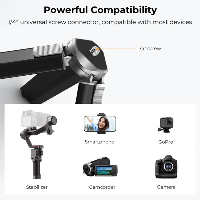 - * Széles körű kompatibilitás: Az állvány teteje 1/4 hüvelykes interfésszel rendelkezik, támogatja a 20 kg-os teherbírást, alkalmas kamerák, mobiltelefonok, töltőfény, stabilizátorok és egyéb berendezések felvételére és támogatására.