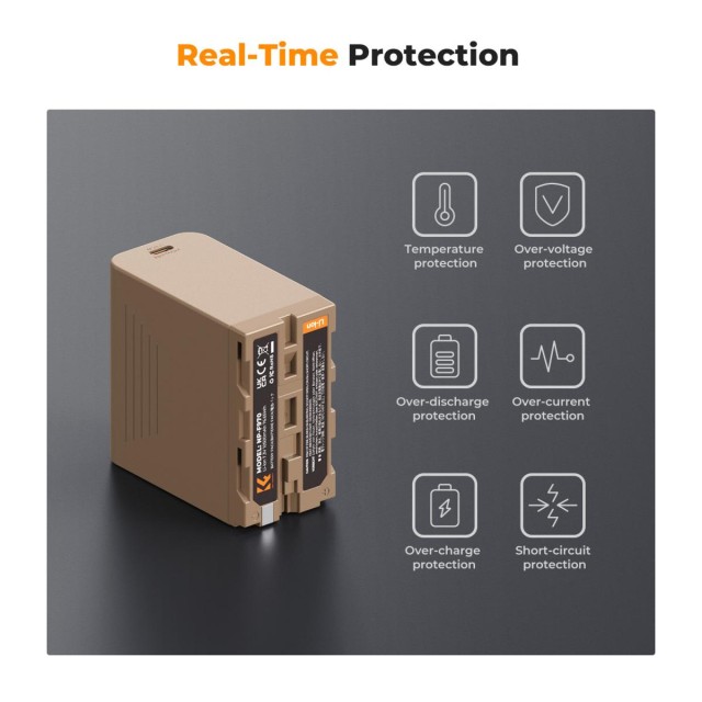 Ez az NP-F970 akkumulátor USB Type-C nagyáramú töltőporttal (PD3.0/20W) rendelkezik, amelynek teljes feltöltése mindössze 4,8 órát vesz igénybe, ami a hagyományos töltéshez képest 40%-kal csökkenti a töltési időt. Az akkumulátor töltöttségi szintje 25%, 50%, 75% és 100%. Az akkumulátor állapotának ellenőrzéséhez egyszerűen nyomja meg a "CHECK" gombot a kijelzők aktiválásához.