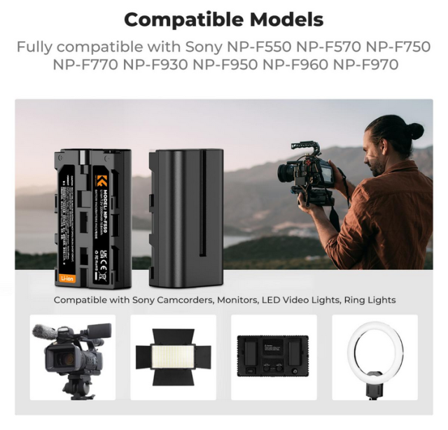 Széles körű kompatibilitás: Ezek az akkumulátorok számos Sony videokamerával és eszközzel kompatibilisek, amelyek NP-F550, F570, F750, F770, F930, F950, F960 és F970 akkumulátorokat használnak, így sokoldalúan felhasználhatók különböző beállításokhoz.