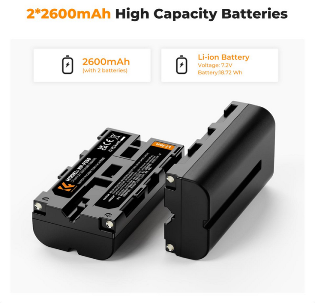 Nagy kapacitású akkumulátorok: Mindegyik NP-F550 akkumulátor 2600mAh teljesítményt nyújt, így hosszú távú teljesítményt biztosít fényképezőgépének vagy videófelszerelésének.
