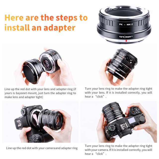 A K&F Pentax K–Nikon Z adapter lehetővé teszi a Pentax K-bajonettes objektívek használatát a Nikon Z-bajonettes tükör nélküli fényképezőgépeken. Sima rézszerkezettel, teljes manuális működtetéssel és végtelen fókusszal rendelkezik.