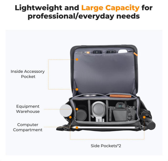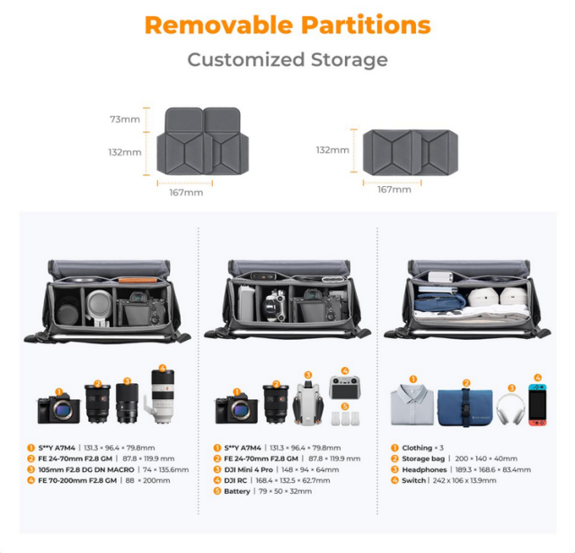 A K&F Sling Bag 10L U10 azok számára készült, akik stílusos, mégis funkcionális megoldást keresnek fényképezőgépük és tartozékaik szállítására. A modern, elegáns dizájnnal rendelkező táska tökéletes a profi fotósok és az alkalmi felhasználók számára egyaránt. A tágas főrekesz testreszabható elválasztókkal rendelkezik, így hatékonyan rendszerezheti felszerelését. Ideális több fényképezőgépváz, objektívek és egyéb alapvető dolgok szállítására.
