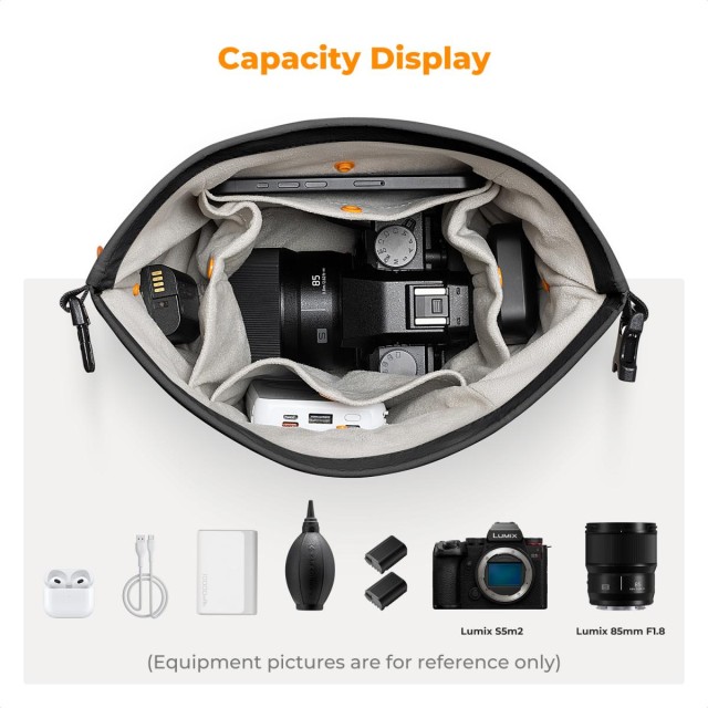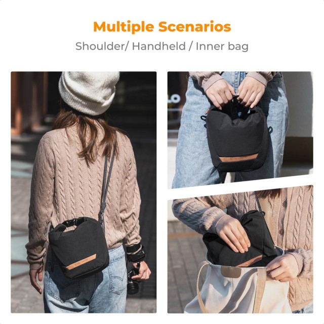 Ez a roll-up stílusú táska tartós poliészterszövetből készült, és könnyű szerkezetű, biztonságos, kontrasztos gyantából készült patentokkal védi a felszerelését. Sokoldalú kialakítása lehetővé teszi, hogy válltáskaként, futártáskaként, pénztárcaként vagy belső kameratáskaként is használható legyen. A rozsdamentes acélgyűrűkkel és bőr szegélyekkel ellátott, állítható vállpánt külön pántként is használható akár 1,5 kg súlyú fényképezőgépek számára.