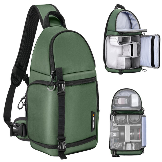A K&F Sling Bag 10L Urban Wander 02 (zöld) egyesíti a praktikumot és a stílust, tágas, mégis kompakt kialakítást kínál a fényképezőgépek szerelmeseinek. Ez a 16 x 8 x 6 hüvelyk méretű fényképezőgépes hevederes táska bőséges tárolóhelyet biztosít, beleértve egy nagy alsó rekeszt, amely testreszabható moduláris betétekkel rendelkezik az objektívek és vakuegységek számára, valamint egy felső rekeszt a személyes kiegészítők számára.